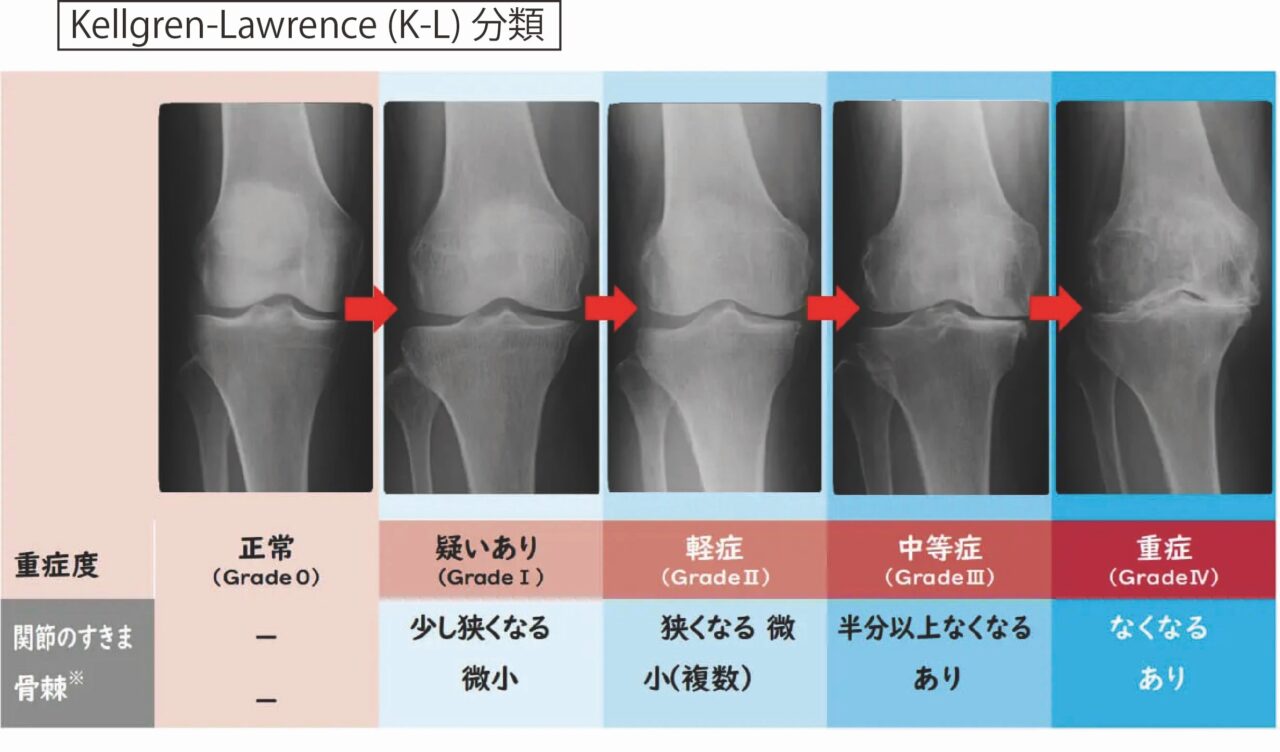 変形性膝関節症の分類はKellgren-Lawrence分類が使われます。これは膝のレントゲン写真で骨棘(骨の棘)と関節の隙間でGrade0・Ⅰ〜Ⅳに分けられます。
